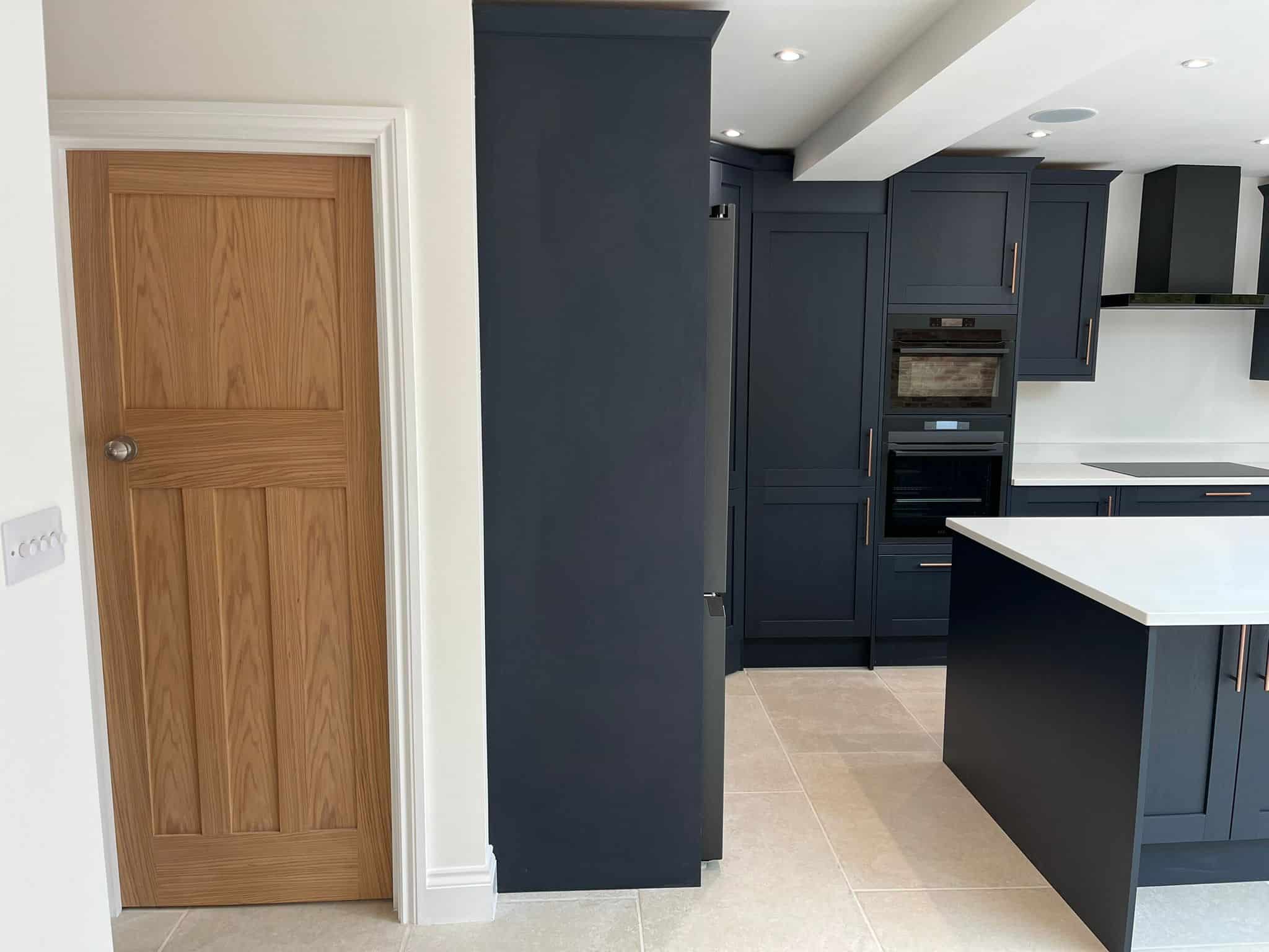 Surrey Developments constructed a wrap-around rear extension with a bespoke specification to meet the client’s exact requirements. The extension includes an open-plan kitchen, utility room, WC, boot room, and a dedicated office. Outside, a raised porcelain patio and brick planter were added to complement the new interior space and extend living into the garden.